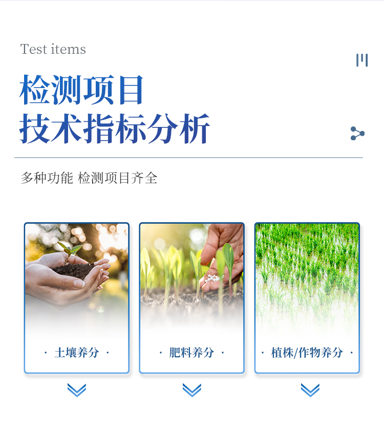 土壤元素,土壤铵态氮、土壤有效磷、土壤速效钾、土壤硝态氮,肥料元素氮肥中铵态氮、肥料硝态氮、尿素氮、缩二脲、磷肥中磷、磷肥中水溶性磷,作物元素,作物硝态氮、作物铵态氮、作物磷、作物钾、作物钙、作物镁、植株元素,植株全氮、植株全磷、植株全钾土壤环境土壤水分、土壤温度、土壤PH、土壤盐分