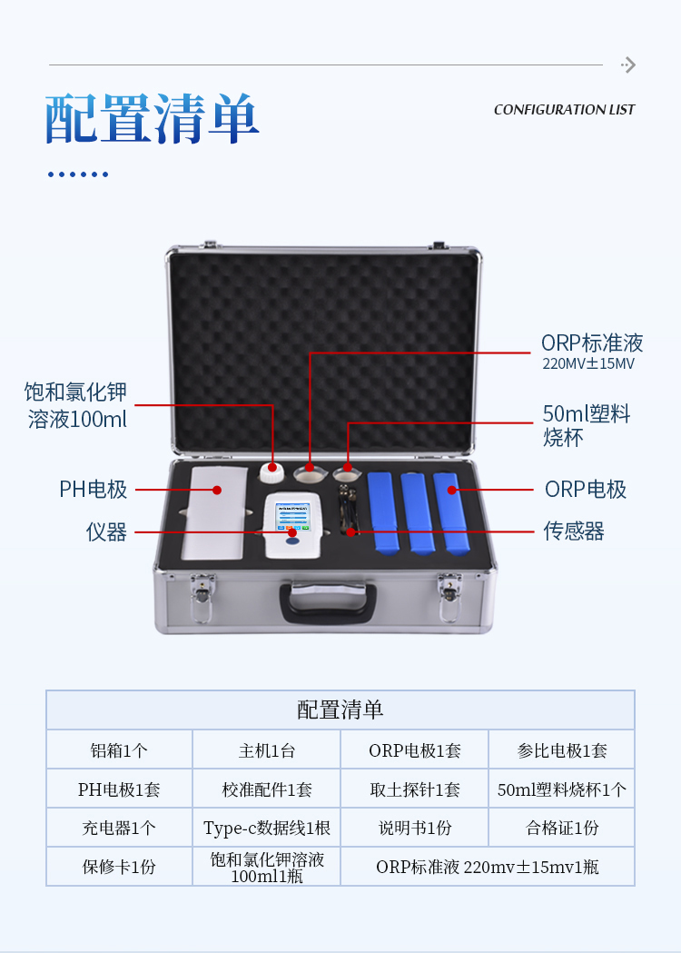 5、配套专用ORP电极、参比电极和不锈钢空心杄,可直接插入土壤;